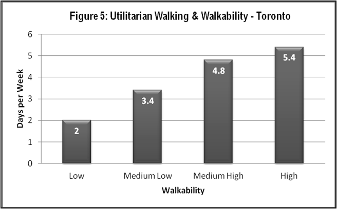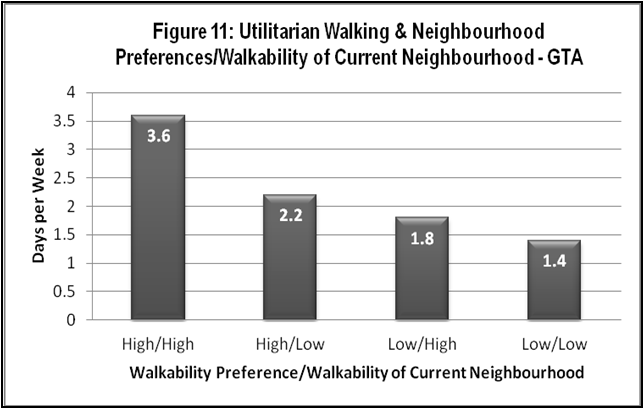 When the travel patterns of survey participants across the GTA were compared against both, the design of the residents’ current neighbourhoods, and the residents’ preferences for walkable or auto-oriented neighbourhoods, it was found that residents who live in walkable neighbourhoods do significantly more utilitarian walking, use transit more, and drive less often and less far, than those living in auto-oriented neighbourhoods regardless of their neighbourhood preferences.